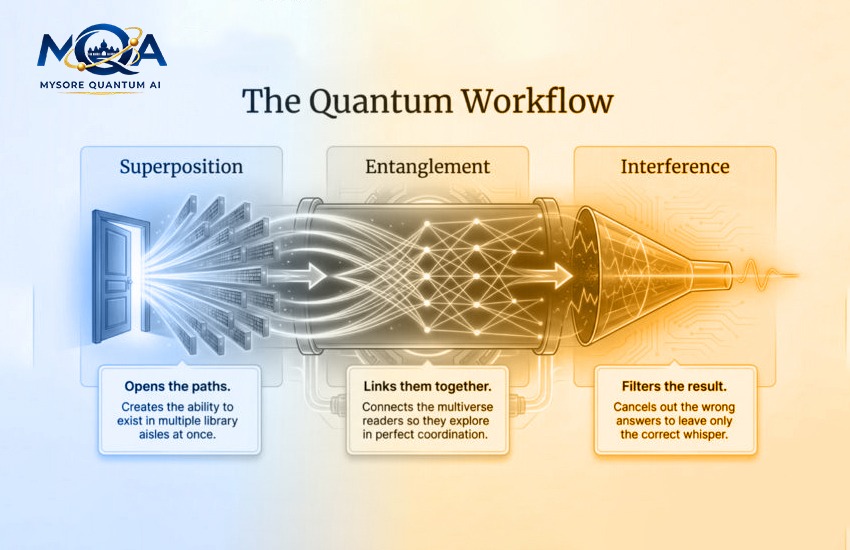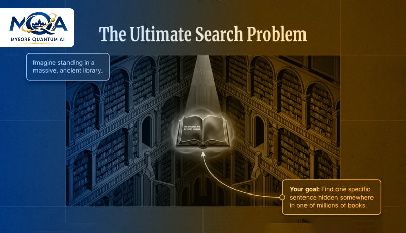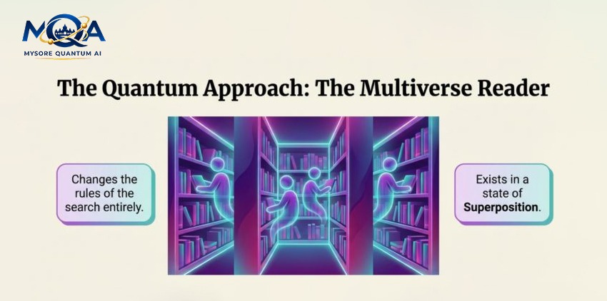 A quantum computer doesn’t just read faster; it changes the rules of the search entirely. Instead of one reader, imagine a “ Multiverse Reader” who can exist in a state of Superposition.